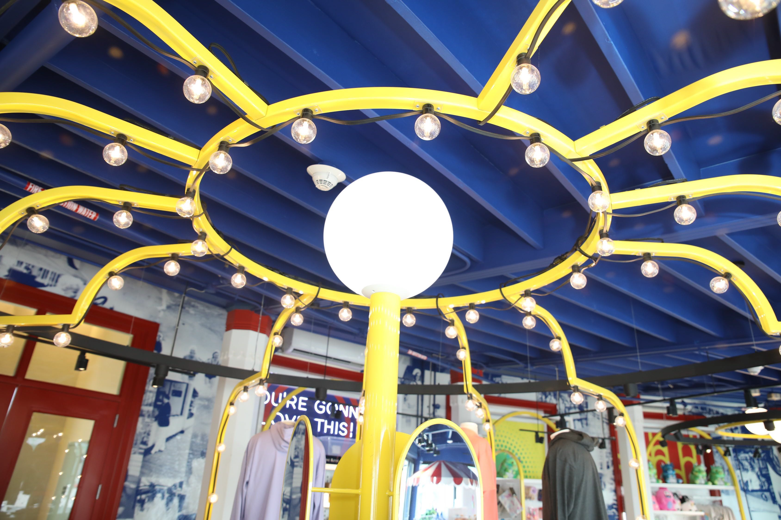 This souvenir shop’s open floorplan and bright colors immediately invite patrons to come in and continue to experience the excitement that is Playland’s staple. The main check out’s circular design allows for a plethora of toys and trinkets to be displayed and catch the eye. While the younger patrons can enjoy the different toys and bright designs, the older patrons can appreciate the art deco design that was incorporated into every element of the design.