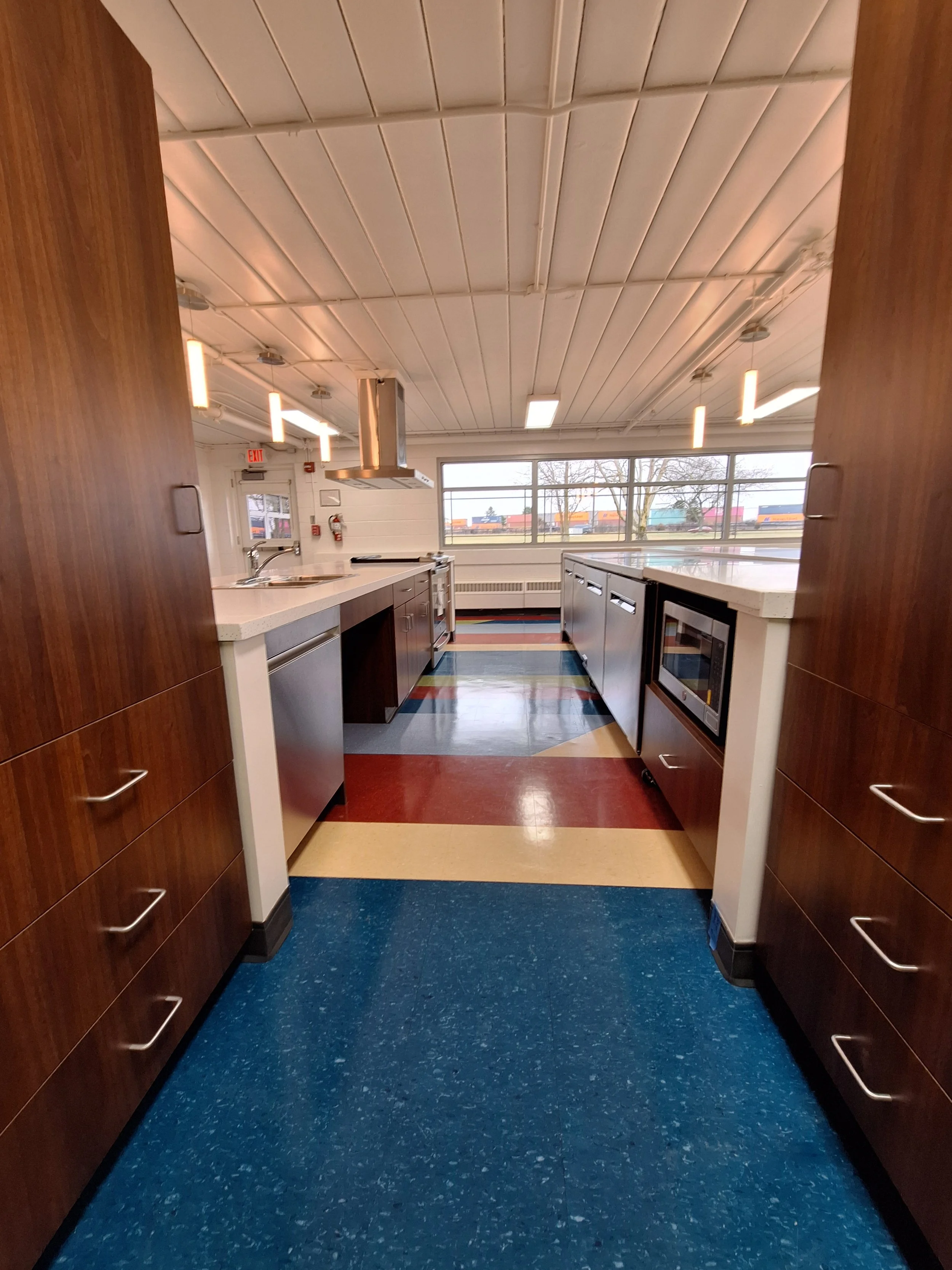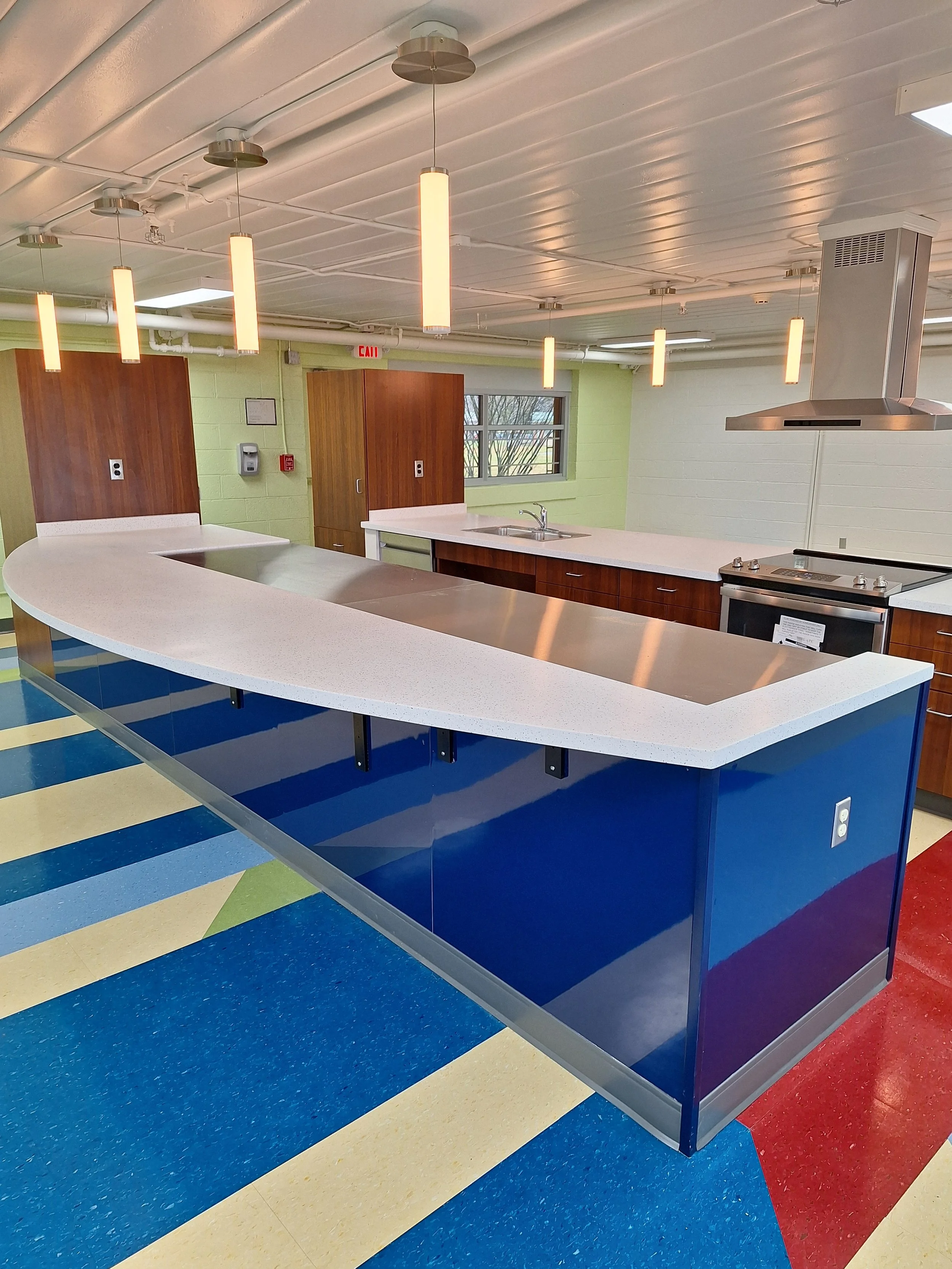 The completed product provides a space that allows staff and older students to create meals for themselves and fellow classmates and peers. The multi-colored, solid-surface countertops create a youthful, fun environment firmly set by the stainless-steel appliances and custom fabricated cabinetry. The open design allows for everyone to socialize and clearly see one another to ensure communication is easily done.